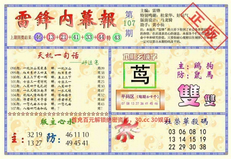 107期:发财七肖【马虎鼠蛇猴羊鸡】开:鸡33准 |